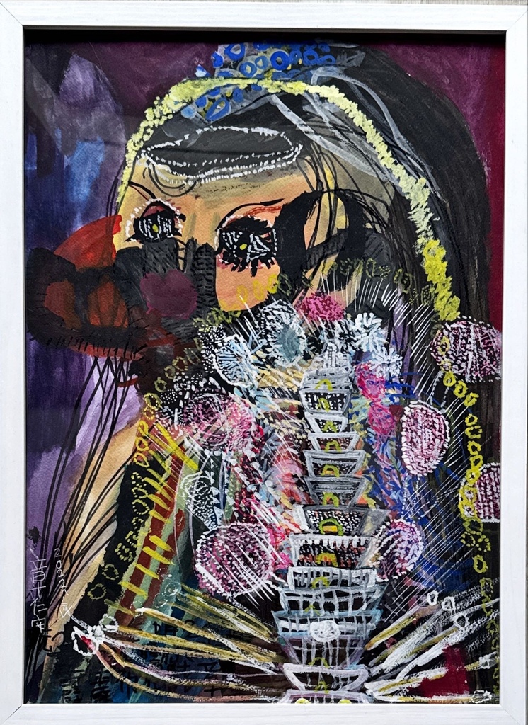 《小姐·天際塔的焰語》以色塊層疊與曲線構圖描繪城市之夜;剪影裡,一道光脈如花火,將女性與天際塔意象重疊。童真筆觸與留白共鳴,呈現溫柔而堅定的守望。