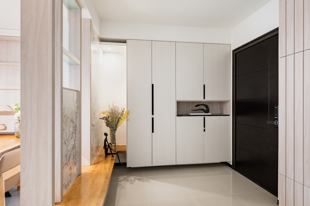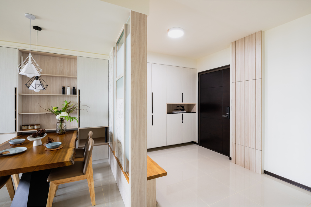 以鏤空複合材屏 建立門廳界線,兼顧導光、隱私與收納,保留明亮的穿透感。
