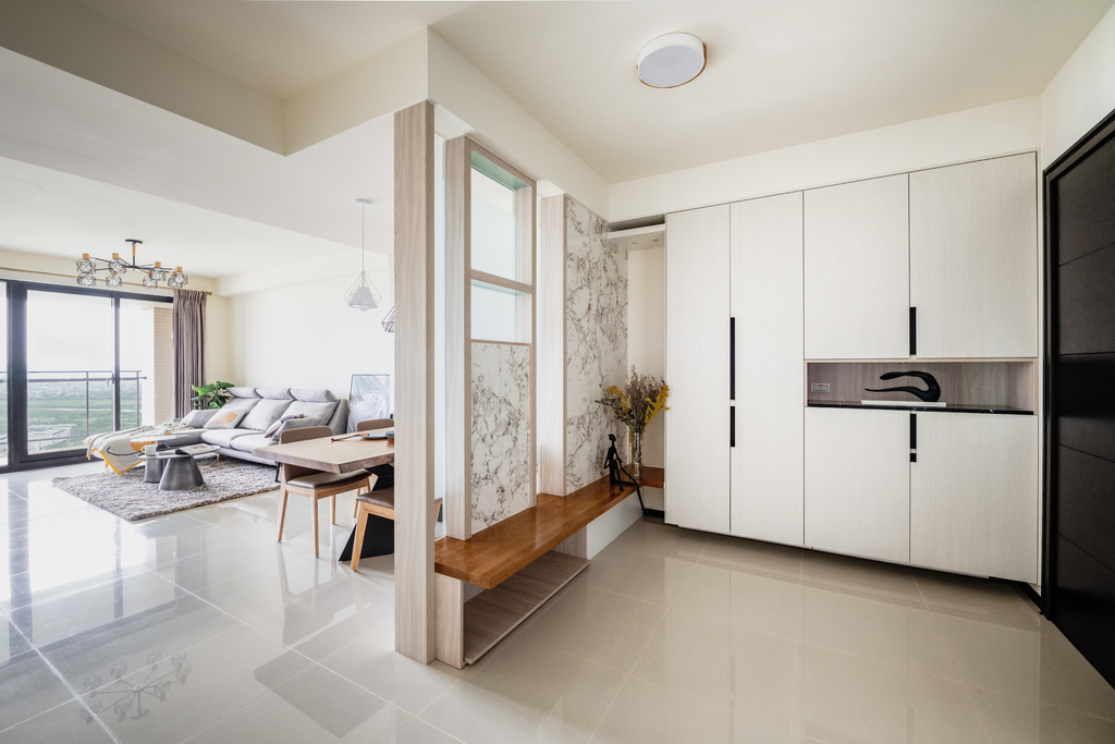 原始格局直視陽台,考量傳統風水中「門對門/門對窗」顧忌,設計以石紋、木紋、霧面玻璃 混搭的鏤空結構牆 ,定義獨立門廳與穿鞋位;既強化隱私 與導光,也保留明亮通透的視覺節奏。